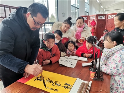 “做公益奉献社会,很开心也理所当然。"做扶贫帮困,捐资助学慈善活动有10多年经验的咸安区书法家协会副主席彭军一上午手未停过,一会儿教小朋友写字,一会儿写字送村民,忙得不亦乐乎,一上午送出50余幅新年字画。