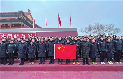 本报综合消息 “为了祖国,冲冲冲!不负人民,拼拼拼!”昨日清晨,在北京冬奥会开幕倒计时10天之际,北京冬奥会中国体育代表团的100余名运动员和教练员代表来到天安门广场观看升国旗仪式,并宣誓出征。