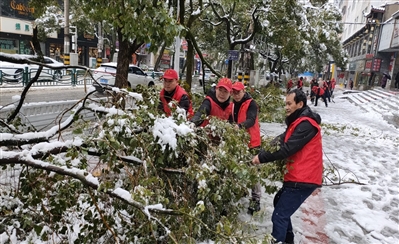 当日,在通城县的大街小巷里,交警、城管、环卫等部门紧急行动,清理大雪压断的树枝,清扫路面的积雪,全力保障市区道路畅通。