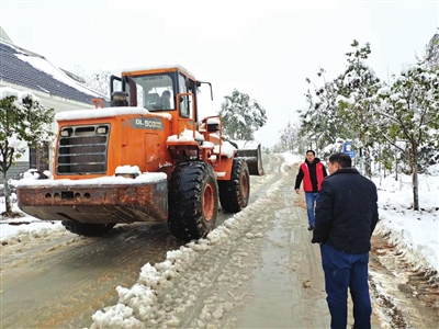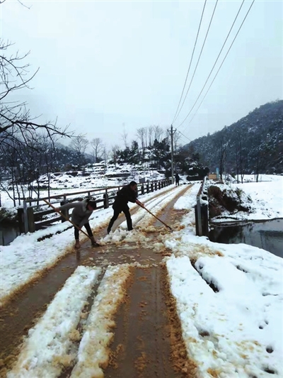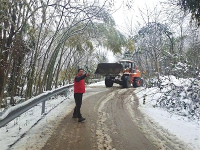 2月7日清晨,市人大办公室驻嘉鱼县官桥镇舒桥村工作队在巡查中,发现该村丘陵片区通往3组、7组的道路有大量积雪,将树木、楠竹压倒,存在交通安全隐患,影响了村民出行,队员马斌、任军与村支书杜耀静商议后,调来了铲车,清理被冰雪压弯、横在路中竹子和积雪,使道路恢复畅通。