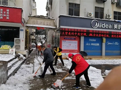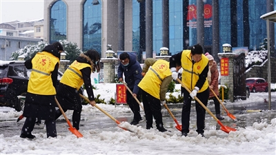| 2月7日,为保障法院内外交通道路畅通和办事群众出行安全,市法院积极组织全体干警集中开展扫雪除冰活动,并派出部分干警下沉包保社区和路段支援扫雪护行。 (特约记者蒋昊) |