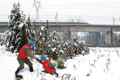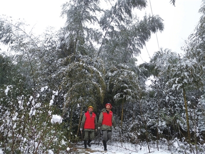 2月7日上午9点,在赤壁市泉口,咸宁供电公司“跑山电工” 夏国华、严泽烈等人正冒着风雪巡视220千伏宝泉一、二回线路,这两条线路是为武广高铁供电的线路,春运期间的安全运行十分重要。