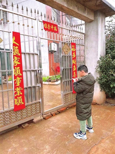 “李天恒在抄写对联。”2月3日,银桂学校四(1)班学生李天恒家长将孩子抄写对联的照片上传到班级群。抄写对联是今年寒假的特色实践作业之一,2月2日开始,李天恒陪同父母走亲戚拜年,随身携带了纸笔,每到一处都会掏出本子记对联。