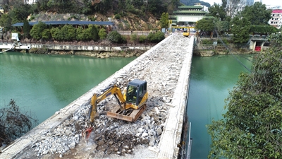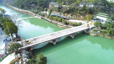 2月18日,市区温泉桥(一号桥)加固整治工程启动。20日,记者在施工现场看到,桥体两端封闭禁止通行,两侧护栏已经拆除,施工机械正在对桥面的铺装层进行铲除清理,各项工程有序进行。