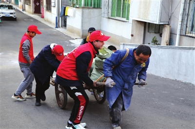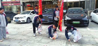 途中,志愿者们随手捡起路边的垃圾。进入小区,志愿者们拿起扫帚、簸箕和清洁球,打扫广场、马路,清洁绿化带,清除卫生死角以及少量的“牛皮癣”。
