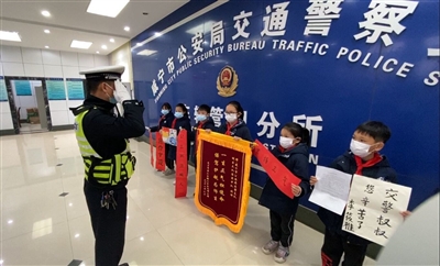 3月21日,咸宁市实验第二小学校长谭璐带领部分学生和家长代表来到城区大队,将一面锦旗和一份感谢信送到执勤交警手中。