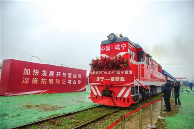3月25日上午11:38分,咸宁火车站货场。随着一声嘹亮的汽笛鸣响,我市首趟中欧班列“长江号”缓缓驶出,奔向万里之遥的俄罗斯首都莫斯科。