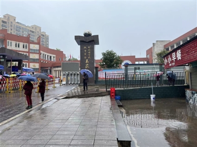 尽管下着蒙蒙细雨,但学校门口仍是一副整洁有序的模样: