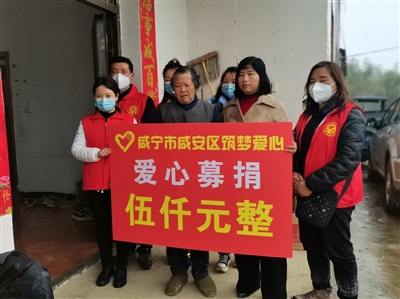 本报讯(记者 杜培清)“你们都是好人啊,感谢你们.....”3月31日,咸安区高桥镇澄水洞村,刘婆婆接过咸安筑梦爱心协会志愿者送来的5300元爱心捐款时,泣不成声,不停地道谢。
