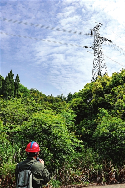 4月19日,在咸宁通山大畈光伏发电站110千伏岩吴线27号塔下,国网咸宁供电公司丰源电业公司两名“跑山电工”正熟练地操作着无人机有序巡视,无人机的镜头详细记录了该铁塔周围树障、瓷瓶等情况。