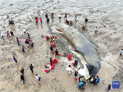 19日上午,一头抹香鲸在石浦镇海域搁浅。当地渔政人员和水生野生动物救助中心人员到现场救护,随后当地消防、民间救援组织以及一些渔民也陆续参与到营救行动中。据现场救援人员介绍,这条抹香鲸长约20米。救援人员努力将抹香鲸拖离搁浅区,由于海水退潮导致救援中断。晚10点,潮水已经涨到最高位置,多艘救援船只出发靠近抹香鲸展开二次救援,20分钟左右,救援船只已将鲸拖离搁浅地约5海里。救援人员继续带它向深海方向行进50海里,送它回家。