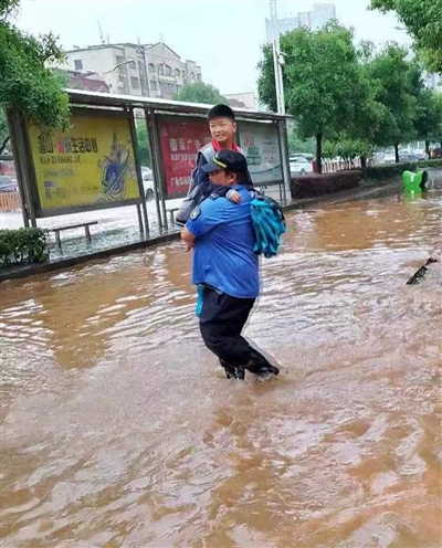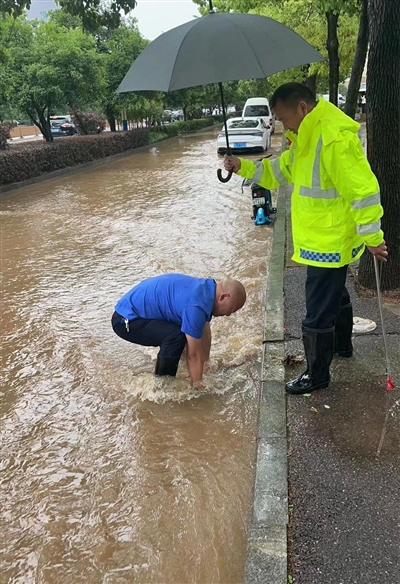 打开雨水篦、窨井盖,徒手清掏树叶、垃圾杂物,加快排水;安排专人值守被雨水冲起的雨水篦、窨井盖,设置三脚架提醒过往行人车辆注意安全;抱着被困的小孩、搀扶市民,趟过积水,直至安全地带……城管防汛抢险人员雨中前行,雨水夹杂着汗水湿透了衣背。