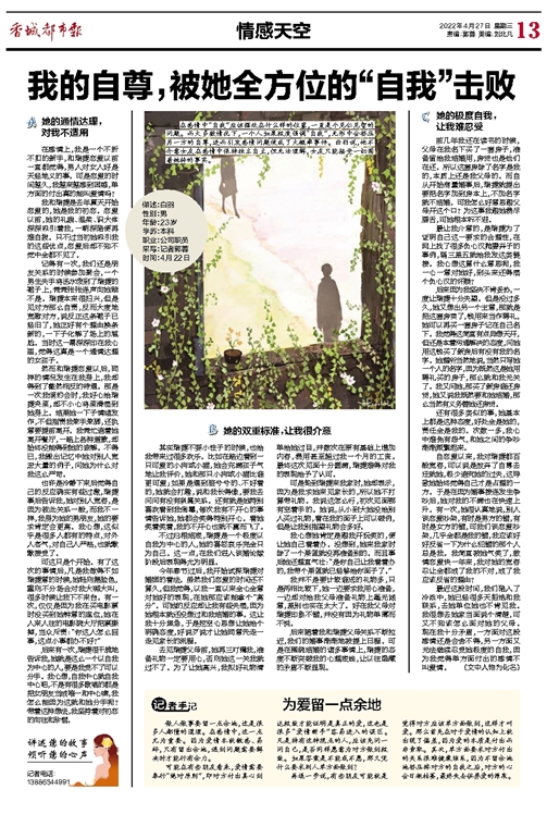 在感情中“自我”应该摆放在什么样的位置,一直是个见仁见智的问题。而大多数情况下,一个人如果极度强调“自我”,无形中会挤压另一方的自尊,进而引发感情问题便成了大概率事件。白羽说,他不介意女友在感情中保持独立自主,但无法理解,女友只能接受一切围着她转的事实。