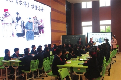 如果说当日的推门听课,让教师们受益匪浅,得到满足和享受。那么,当天最吸引人眼球的当属该校502班王春霞老师和她的孩子们给大家呈现一堂语文展示课——《水浒传》阅读分享课。在这里,整节课是由几个小主持人轮流主持完成,语文老师王春霞总是在最恰当的时机里出现,又及时退出。整节课里,几乎听不到老师大段的讲解,甚至话很少,看似学生学习的旁观者,但其实她一直都在保持着警惕,静静倾听和观察,每次的点拨都是字字珠玑,巧妙点拨,及时把控。