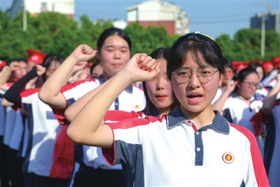 “今天,我已长大成人,面向国旗,我以青春的名义宣誓……”随着千余名学子高举右手握拳发出成人誓言,操场上空声音铿锵有力,响彻云霄,将成人礼仪式推向高潮。