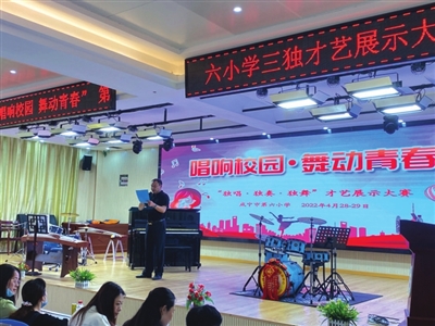 本报讯(记者夏咸芳 通讯员周鑫森)为大力推进素质教育,丰富全校师生的精神文化生活,增强学生的班级荣誉感,熏陶学生的艺术修养,4月28至29日,咸宁市第六小学举办了以“唱响校园·舞动青春”为主题的校园才艺展示大赛活动。