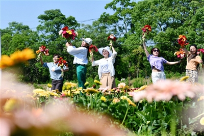 5月6日,通城县石南镇赛公村非洲菊基地,不少游客慕名前来采摘游玩。