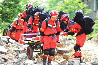 实战模拟中,按照地震灾害响应和跨区域增援方案,结合“灾区”实际,设置力量集结、无人机侦察、徒步行进、营地搭建,现场医疗急救、废墟搜索、狭小空间救援、建筑坍塌救援、坑道支护救援、绳索救援、向上破拆救援、车辆事故救援,战时政工宣传等16余个科目,实地检验和考核救援应变能力,围绕国际通用的“管理、搜索、营救、医疗、后勤”五大模块,建立完善安全管理机制将作战安全管控贯穿导调和演练全过程。