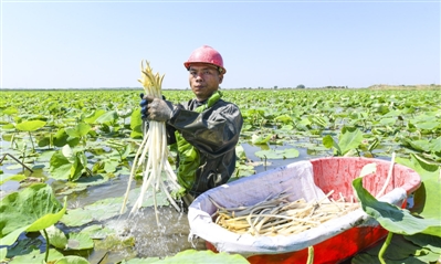 5月6日,嘉鱼县新街镇三畈村西凉湖畔,嘉鱼振鑫蔬菜有限公司基地,工人们正在采收藕带。从4月中下旬开始,该基地每天采藕带1000余公斤,全部走物流专车发往广州华南市场。基地带动了当地10余农户家门口就业,每户年增收4万余元。
