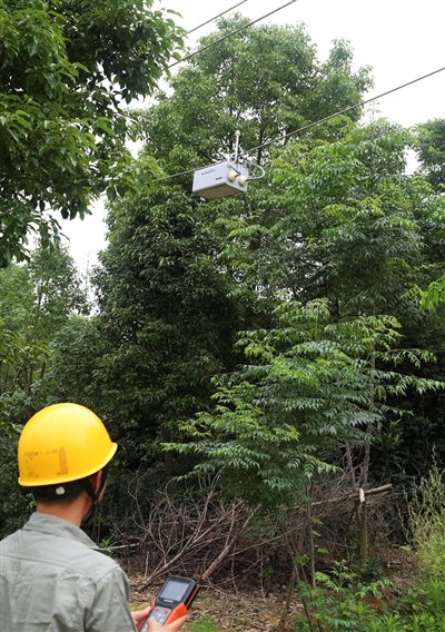 5月27日,咸安区王仲用村,一台智能机器人在带电运行的10千伏电线上涂覆绝缘材料,机器人所过之处,原有的金属导线多了一层灰黑色的绝缘层。