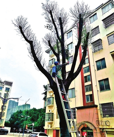 金桂路世纪花苑陈姓物业工作人员说,小区内之前修剪的大樟树,今年长出的新芽被虫啃“秃”了,树干上密密麻麻的长满了黄色、绿色的小爬虫。为了彻底消灭这些虫子,物业工作人员背上药箱爬到树上施药。