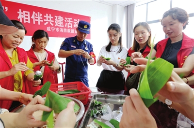 本报讯(通讯员 金珣)粽叶飘香火焰蓝,文明社区志愿红。6月2日,浮山街道银泉社区全体工作人员走进咸宁市消防救援支队金桂路特勤站,与消防指战员们共度端午。