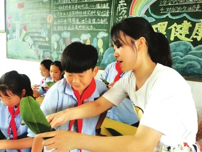 6月2日下午,市第五小学504中队热闹非凡,热心的家长们耐心地向同学们传授包粽子的技巧,一双双稚嫩的巧手飞舞,学得有模有样。不一会,一片片清香的粽叶、一粒粒晶莹的糯米、一颗颗香甜的蜜枣,在一折一系间变成了形态各异的粽子,欢笑声充满课堂。
