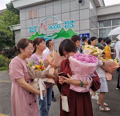 昨日下午4时,鄂高考点门口围满了手捧向日葵花束的家长。“高中三年,孩子也很辛苦,终于考完了,为女儿买了带六朵向日葵的花束,希望她一举夺‘葵’,考上梦想的大学。”抱着花束的黎女士说。