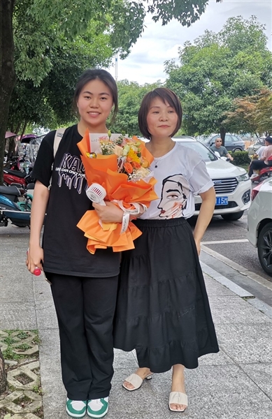 4时40分,考完最后一门的女儿走出鄂高考场大门,看到妈妈黎女士抱着鲜花来接自己,脸上露出惊喜的笑容,一路小跑,和妈妈拥抱在一起。