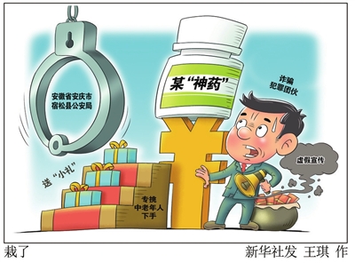 新华网消息 评书机、老人鞋等“小礼”请先笑纳,“包治百病”的“神药”快来试试?小心“骗你没商量”!记者日前从安徽省安庆市宿松县公安局了解到,当地警方打掉一个向中老年群体虚假宣传兜售药品进行诈骗的犯罪团伙,全国多地数千人上当,涉案金额近千万元。