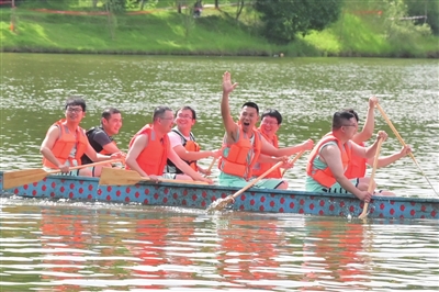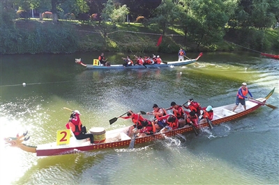此次比赛采取混合组10人、龙舟200米直道竞速,比赛共设2条航道,两两赛速,采取预赛、半决赛、决赛三个阶段进行。比赛中,参赛队伍在起点一字排开,随着裁判员一声令响,队员齐心协力,奋力击水,手起桨落,龙舟在水面上劈波前行。湖面鼓点声声,岸上呐喊阵阵,热闹非凡。经过多轮捉对比拼,星星之火队、飞鱼队、万里阳光队揽得前三名。