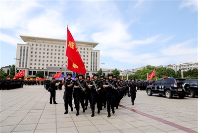现场,警旗迎风招展,警歌雄壮嘹亮,每名特巡警队员军姿如铁、警容严整、装备齐整、斗志昂扬。