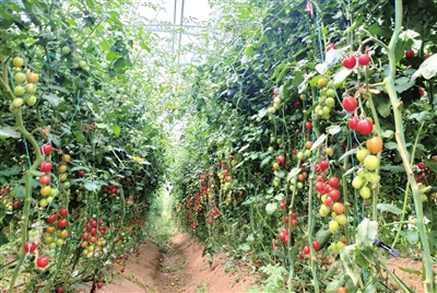 记者走进蔬菜大棚,闻到阵阵蔬果清香,只见一个个红彤彤、色泽鲜亮、个头饱满的圣女果挂满枝头;一根根翠绿的黄瓜长势喜人,前来游玩的市民穿梭其中,采摘新鲜蔬果,享受丰收的喜悦。