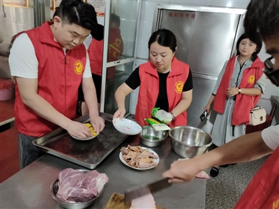 在其他志愿者为老人们理发、剪指甲、拿脉问诊量血压时,焦剑和另外一名厨师在切肉配菜。洗青菜、捏蛋饺、包苕粉坨、锤粉子肉,来自居然之家奥华集成吊顶的女志愿者余芬和其他几名女志愿者积极协作,不到一个小时,十余份“大菜”就配好了。