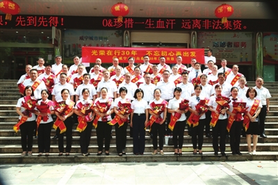 在经久不息的掌声和喝彩中,他们身披红绶带,走上红地毯,从行长手上接过鲜花,绽放自豪幸福的笑容——这一幕,深深定格在工行咸宁分行的史册上,更牢牢的镌刻在每一位工行人特别是受到表彰的“光荣在行30年和光荣在岗30年”员工心中。