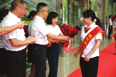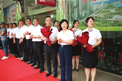 7月8日下午2点30分,在工行咸宁分行一楼,一场隆重欢迎仪式开始进行:在行长楚晓琳带领下,近百位工行人分成两列站在红毯的两旁,为“光荣在行30年和光荣在岗30年”56位老员工献上鲜花、掌声和崇高的敬意,感谢他们的忠诚、担当和30年如一日对工行的付出。