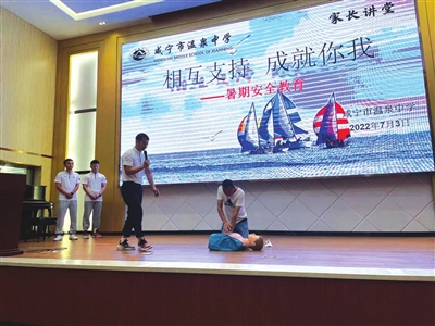 本报讯(记者熊大平 通讯员傅祖斌)“‘拔草种树’通过培养有益的兴趣爱好占领孩子的时间,精心策划,以身作则,家校合作,不断进步。”近日,温泉中学召开暑期安全教育活动,校安办骆光辉老师的暑期生活建议分享,受到学生家长的好评。活动现场就暑期安全的相关事宜开展教育以及心肺复苏的教学。