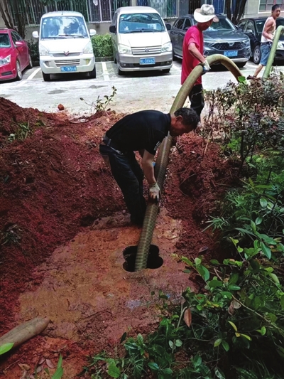 “在老旧改项目实施之前,化粪池问题不能再拖了。”市政务服务和大数据管理局相关负责人决定,从单位的经费中拿出一部分,先疏通小区化粪池问题,解决小区的燃眉之急。于是,市政务服务和大数据管理局负责人召集凤凰社区、学苑园小区党支部书记与业委会主任召开商议会,随后请专业疏通人员进行勘察,对引起堵塞的原因进行分析与排查,确定疏通方案。7月8日,该局出资联系污水处理车及挖机进行现场施工,终于将堵塞多年的小区化粪池疏通。
