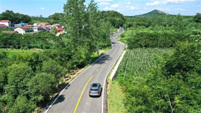 7月8日,咸安区汀泗桥镇,提档升级后的农村公路与房屋、农田、绿树构成一幅美丽的画卷。兴达路桥安达养护公司施工人员正在路上施划标线。