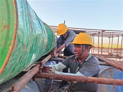 在地表超40度的高温条件下安装,体力是最大的挑战。武广东说,高温天气以来,他和10多名工友一天工作下来,为了维持体力,他们每天都要喝10斤水以上。