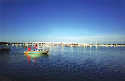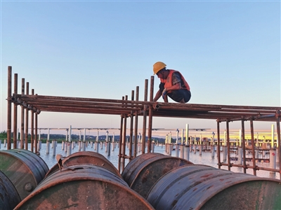 早上6点不到,35岁的武广东和工友们就开始忙活起来。武广东来自辽宁沈阳,是光伏厂区一标段支架组件安装小组班组长,从事支架安装工作有七八年了,每天不停地穿梭在作业船上。持续的暴晒,湖面上的作业船已变成了“烤箱”,高温环境中,武广东和工友们却是长袖、手套,全副武装。