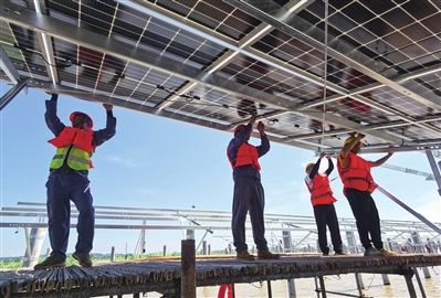 连日来热浪不断袭来,对很多一线的安装工人来说,是一场不小的“烤”验。虽然天气炎热,但他们却依然坚守工作岗位。在华润·赤壁长江经济带乡村振兴示范区日曜350MW渔光互补光伏发电项目建设现场,工人们战高温斗酷暑,追赶工期进度,力争做到早日交付、早日使用。