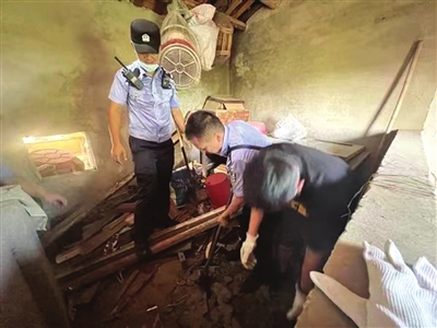 7月13日上午11时,专班民警直奔何某老家,在当地警方配合下,找到何某所述猪圈。此前,嫌疑人挖了近2米深的坑洞,将保险箱埋在地底,还浇上了一层水泥。木顶的窝棚内,温度超过40℃,民警抡起锤子斧头轮番开凿,汗如雨下,费了好一番功夫,才将装有赃款的保险箱抬出。在何某配合下,装有170万元现金的保险箱被顺利打开。