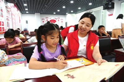 日前,咸安区浮山街道书台社区,咸宁职院外国语学院暑期社会实践“希望家园”活动在此进行。当天,30名孩子在老师的带领下,写作业、学习交通安全知识、阅读英语绘本故事,开展游戏等。记者陈红菊/摄