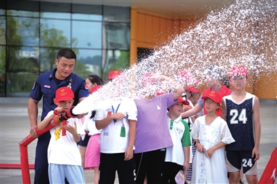 “将灭火器提手(压手)旁的铁销子拉环稍微转动拔出,然后将橡胶软管的喷嘴或喷筒对准火源,人站在上风或侧上风方向,用手压住提手(压手),灭火剂即可喷出灭火。”活动中,消防员带领大家“沉浸式”体验了消防车、个人防护装备等各类消防用具,并耐心讲解了如何利用灭火器灭火。随后,消防员还打开车上的一扇扇小门,深入浅出地为孩子们讲解了消防车的名称、功能以及消防车上的水枪、灭火防护服等。此外,还让各位同学穿上消防服,现场体验了如何出水灭火等项目。