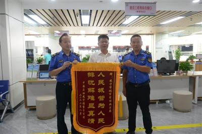 本报讯(记者周阳 通讯员冷辉 岳斌)“人民城管为人民,排忧解难显真情。”8月4日上午,在咸宁市民之家,中石油咸宁销售分公司将写有这14个大字的锦旗送到市城管执法委窗口工作人员手中,对该委高效、公正、贴心的服务表示感谢。