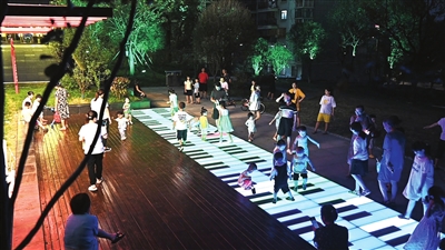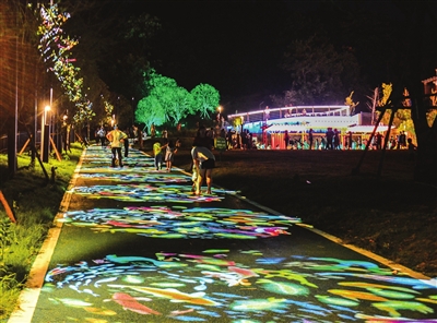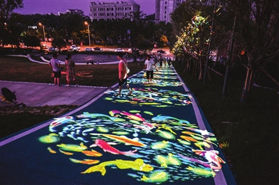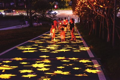 “我们在公园步道做了130米的投影长廊,主要为了展示咸宁的生态山水,把市民从坡底引到坡上。”夜景亮化项目总设计师饶坤立说。走进公园步道,锦鲤、樱花、枫叶、蝴蝶四种图案的投影灯交替变换,光影交错、步步生花;上方小广场的网红音乐钢琴灯引来众多市民打卡,钢琴灯由两列琴键组成,踩上琴键便会变换不同的颜色,辅以欢快的音乐,增加了市民的互动性和趣味性。此外,公园还增设了动感水纹、夜光座凳等夜景灯光,给市民带来了全新的夜游体验。“整个公园主要围绕树木、围栏、景观等现有的设施来合理布局灯光,同时考虑节能和环保的问题,力求舒适、自然又能突出重点。”