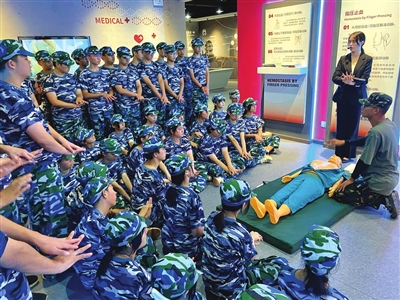 在第二个初识人防主题展厅,学生们动手操作不同类型的警报器,亲身体验警报器的发报,感受人防部门在临战状态下怎样疏散城市居民。教官通过模具教授学生们心肺复苏、止血包扎等救护技能。