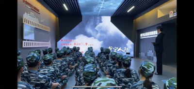9月2日,在咸宁市梓山湖青少年综合实践学校实训楼二层,在讲解员鲍梦寒带领下,记者跟随咸宁市温泉高中高一一班30多名军训学生,参观市人防宣教馆。