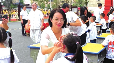 朱砂启智迎成长,击鼓铭志响前程。在庄严的升旗仪式之后,该校教师及家长亲手为孩子们点红“痣”“开天眼”,愿孩子们从此开启智慧、目明心亮,端正品行,健康成长。学生们拱手谢恩师,开笔学描红,一撇一捺写下一个堂堂正正的“人”字。